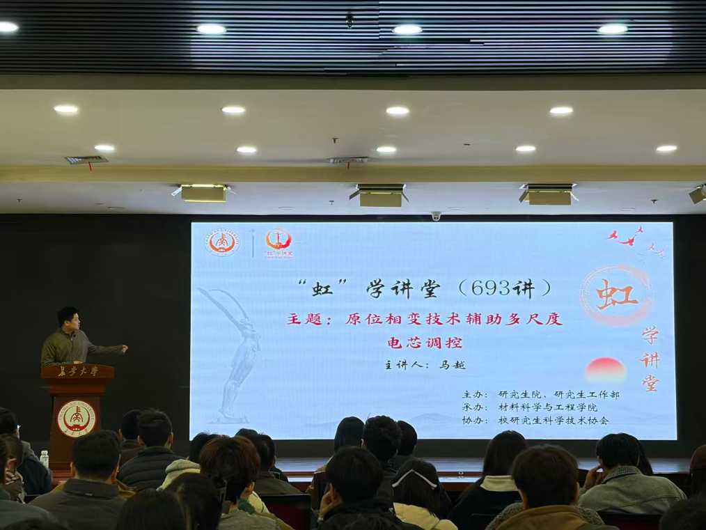 3月19日下午,由研究生院、研究生工作部主办,材料学院承办,校研究生科学技术协会协办的“虹”学讲堂第693讲在北校区大学生活动中心三楼多功能厅顺利举办。本次讲座特邀西北工业大学马越教授作专题报告,围绕新能源电池前沿技术进行深度分享。学院副院长郭亚杰,新能源材料与器件系主任倪磊、副主任苟蕾,学科责任教授樊小勇和实验中心王治桥等骨干教师参加。本次讲座采用线上线下相结合的方式,吸引了材料学院及其他相关院系570余位研究生聆听学习。...