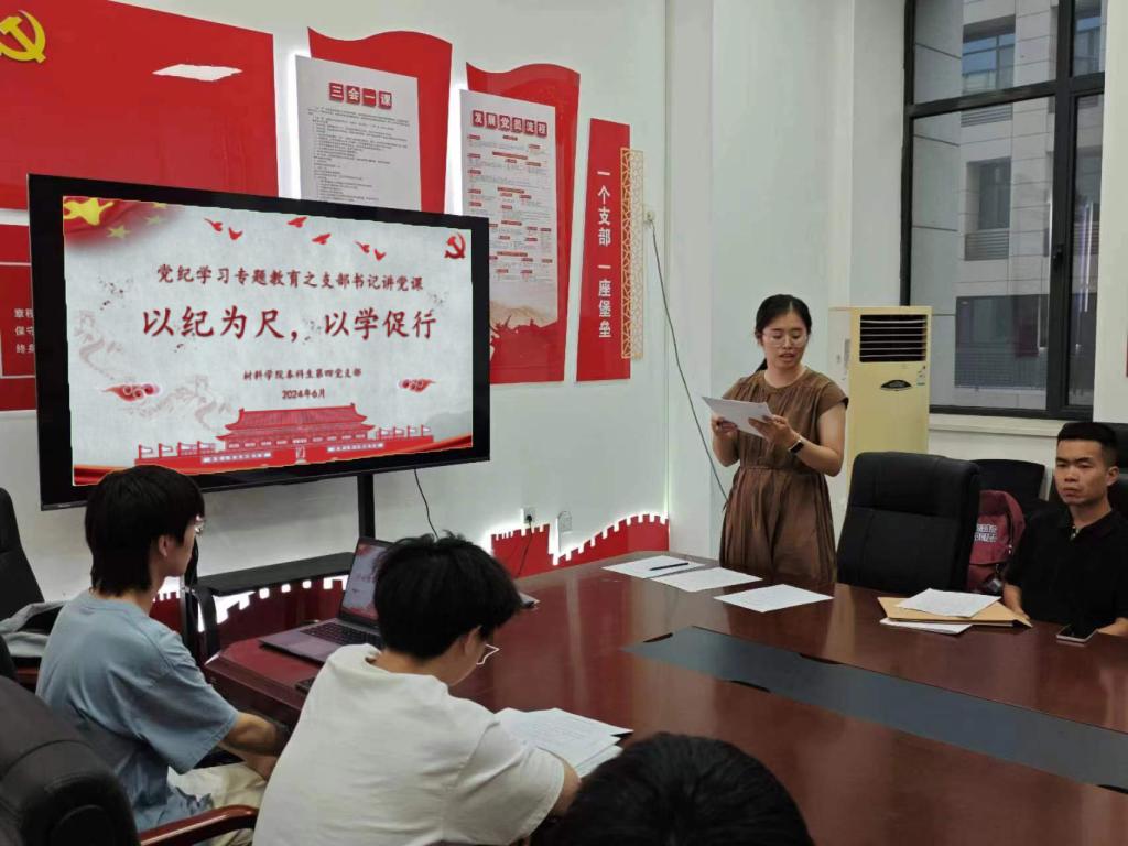 为深入学习贯彻习近平总书记关于党纪学习教育的重要讲话和重要指示精神,教育引导学生党员学纪、知纪、明纪、守纪,进一步加强党的纪律建设,增强学生党员纪律意识和规矩意识,材料学院本科生第四党支部于6月24日下午开展了支部书记讲党课专题活动。本次党课由支部书记肖雅蕊主讲,支部全体成员参加此次学习。