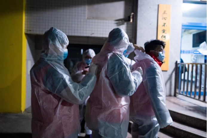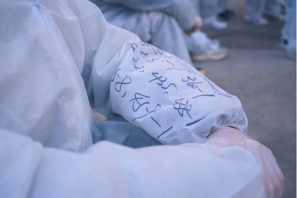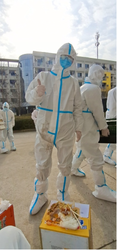 你猜胳膊上写的是什么?19级本科生高泽跃的防护服上写的是需要送餐同学的宿舍号。当志愿者们穿上白色战袍的那一刻,他们的脑子里只有一件事情,就是让同学们吃上美味的餐饮,连休息的时候,都要用这种方式重温今天的任务。