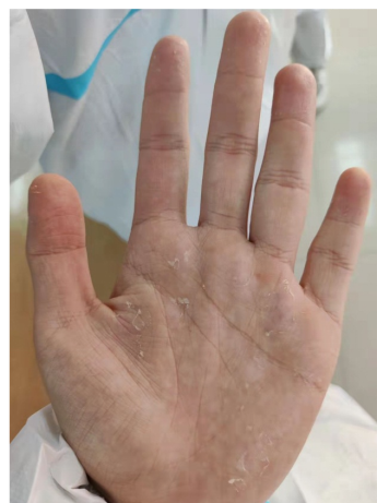 这是志愿者黄帅斌的手,一次次志愿工作后的酒精消毒,使许多志愿者双手脱皮,原本是花儿一样的年龄,原本是父母的宝贝,却披上战袍,成了别人的“守护者”。