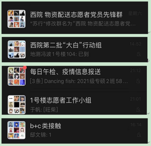 这是一个研究生党员志愿者张哲的手机微信界面,没有八卦,没有闲聊,也没有段子和娱乐推送,有的只是一个又一个的志愿者群,一桩又一桩的待办事项。哪里有需要,我就去哪里!我是党员,我先上!