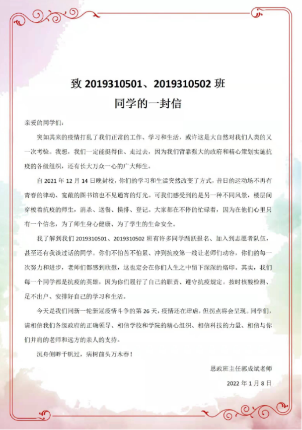 用爱传递爱,爱才能绵长不绝。2019级两个班的思政班主任郭成斌老师虽然身处南院高风险区,却时刻未忘记自己班级的学生,用书信这种最古老的方式,传递了对学生的关切之情,纸短情长,犹如冬日暖阳,温暖了同学们的心。