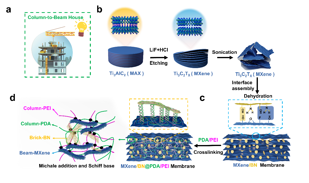 MXene/BN@PDA/PEI膜的制备示意图:(a)具有梁-柱结构的房子,(b) Ti3C2Tx (MXene)纳米片制备,(c) MXene纳米片与BN纳米片组装成2D/2D架构,(d) PDA和PEI通过共价交联反应承担MXene/BN@PDA/PEI复合膜“立柱”部分的作用