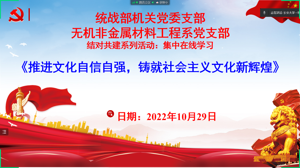 为进一步提升支部共建成效,学习党的二十大精神,深化党员政治理论学习,2022年10月29日下午,我院无机非金属材料工程系党支部与统战部机关党委党支部联合开展支部共建主题活动,以在线会议视频学习的形式,集中观看了由中国政法大学思政研究所副教授、北京市委讲师团主讲老师郭继承主讲的《推进文化自信自强,铸就社会主义文化新辉煌》报告。会议由王耀文部长主持,学校党委委员、常委、副书记徐引正和学院党委委员、副院长王振军以及两个支部全体党员参会。