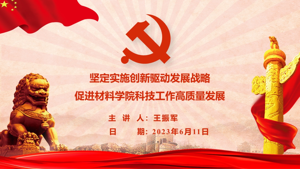 王振军以“材料学院科技工作”为落脚点,以“坚定实施创新驱动发展战略”为切入点,重点讲述了个人对“深入实施创新驱动发展战略,加快建设科技强国”的理解,将习近平总书记关于新时代科技强国战略的重要论述和材料学院科技工作高质量发展紧密结合,为学院科技工作高质量发展提出了具体的意见和建议。