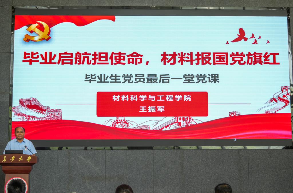 会上,王振军以“毕业启航担使命,材料报国党旗红”为题,为毕业生党员讲授“最后一堂党课”。他结合青年党员的时代使命与学院学科特色,深情回顾了同学们在学期间参与科研实践、志愿服务的难忘瞬间,寄语毕业生党员要始终牢记党员身份,在未来的学习工作中永葆“闯”的精神、“创”的劲头、“实”的作风,将个人理想融入国家发展大局,在新的岗位上续写长大材料人的奋斗篇章。