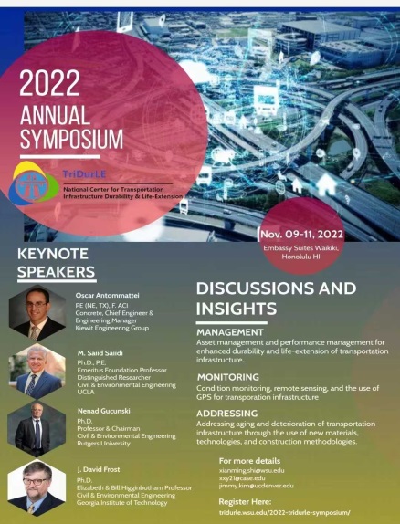 2022119日至11日,由National Center for Transportation Infrastructure Durability & Life-Extension举办的交通基础设施第二届研讨会(TriDurLE 2nd Annual Symposium 2022)在美国夏威夷召开,本次会议主题为“Transportation Infrastructure Durability & Life-Extension”,共有9个分会场,38名国内外行业学者做大会汇报,我院博士生Ahmed Abdulakeem应邀线上做大会汇报。