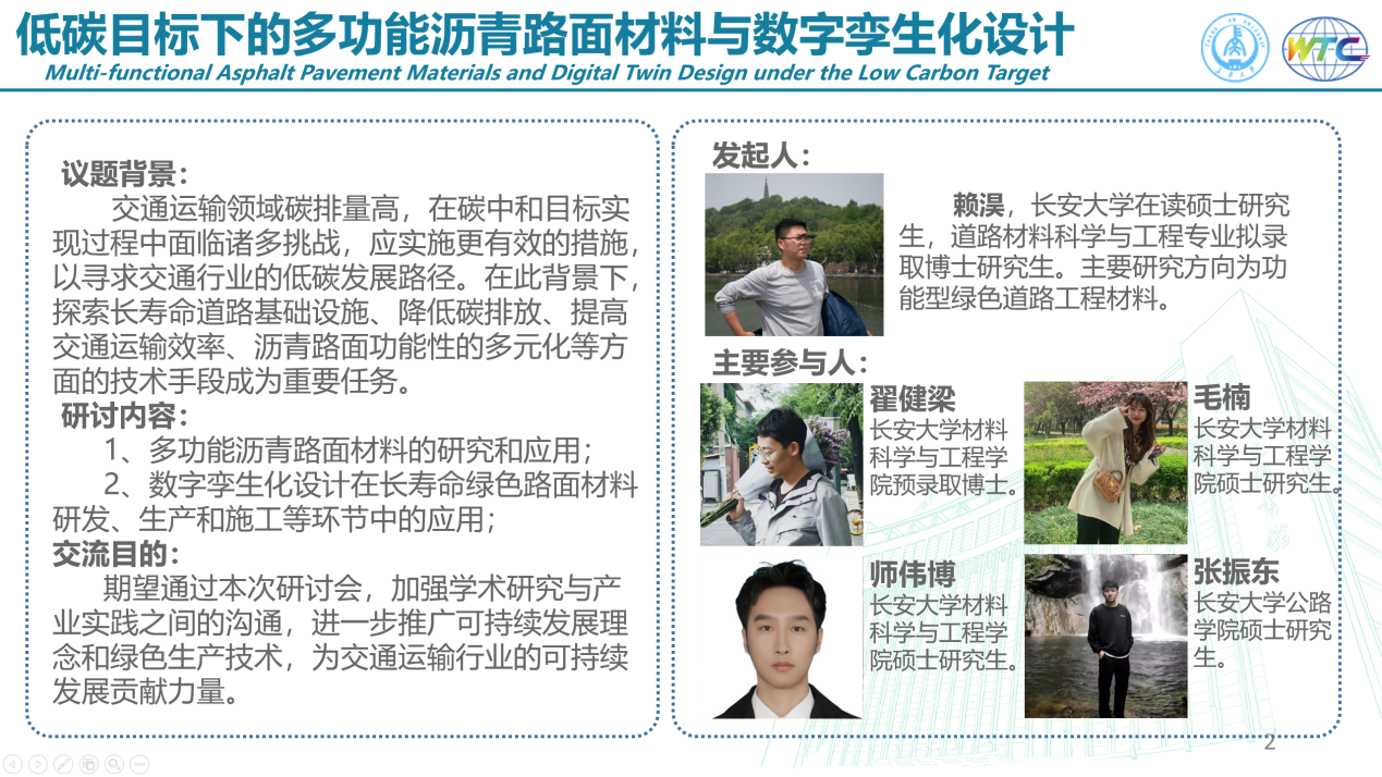6月14日至17日,2023年世界交通运输大会(World Transport Convention,WTC)在湖北省武汉市中国光谷科技会展中心召开。17日上午,由我院2023级博士研究生赖淏、翟健梁,2021级硕士研究生毛楠、师伟博,公路学院2021级硕士研究生张振东共同发起的“低碳目标下的多功能沥青路面材料与数字孪生化设计”特别兴趣会议在中国光谷科技会展中心会议厅成功举办。该会议以交通运输领域在碳中和目标实现过程中面临的诸多挑战为背景,在探索长寿命道路基础设施、降低碳排放、提高交通运输效率、沥青路面功能性的多元化等方面展开了讨论。