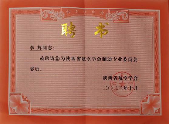 在陕西省航空学会制动专业委员会成立大会暨第一次工作会议上,陕西省航空学会秘书长钟诚文宣读《关于同意陕西省航空学会制动专业委员会成立的复函》,并为制动专业委员主任付鹏锋颁发聘书;会上提名并经委员表决聘任了副主任委员和总干事,讨论并通过了专业委员会工作条例和工作计划。李辉副教授被聘为陕西省航空学会制动专业委员会委员,并参与讨论。