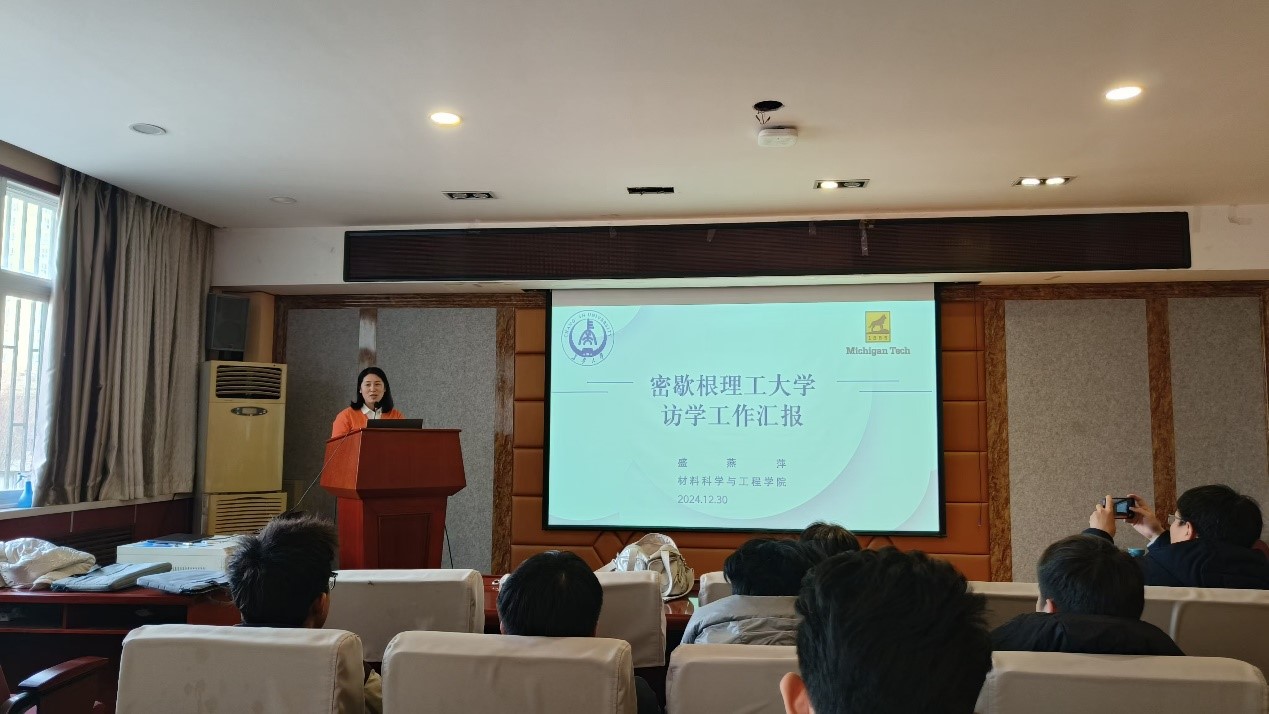 12月30日下午,我院材料科学与工程系盛燕萍教授在校本部西院第五教学楼二楼报告厅就密歇根理工大学(Michigan Technological University)访学见闻及研修成果进行了交流汇报。报告会由材科系牛冬瑜老师主持,学院相关教师和硕博研究生参加。